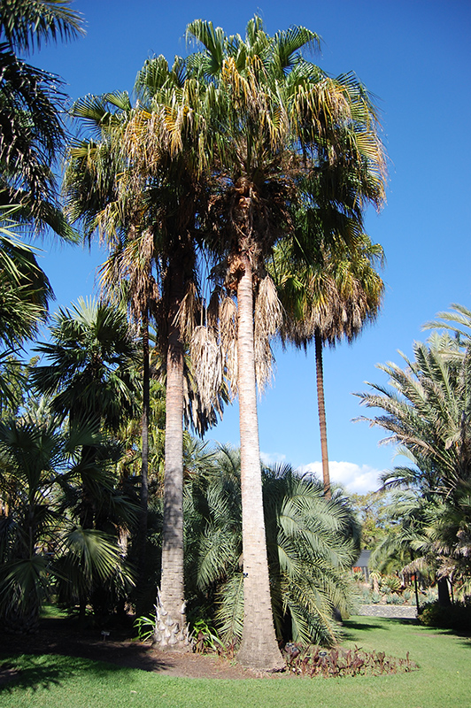 Hardiness Zone: 9a Other Names: Carnarvon Gorge Cabbage Palm, Dawson River Palm Description: This variety produces beautiful, bright green palmate leaves that are deeply divided, with graceful, weeping tips; a nice tropical screen when young, but will ascend on a tall, narrow trunk; very adaptable, and a striking vertical landscape accent Ornamental Features Carnarvon Fan Palm is primarily valued in the landscape for its canopy of attractive foliage which towers high above the ground. It has attractive forest green evergreen foliage. The large glossy lobed palmate leaves are highly ornamental and remain forest green throughout the winter. The rough gray bark adds an interesting dimension to the landscape. Landscape Attributes Carnarvon Fan Palm is an evergreen tree with a strong central leader and a towering form, with a high canopy of foliage concentrated at the top of the plant. Its average texture blends into the landscape, but can be balanced by one or two finer or coarser trees or shrubs for an effective composition. This tree will require occasional maintenance and upkeep, and usually looks its best without pruning, although it will tolerate pruning. It has no significant negative characteristics. Carnarvon Fan Palm is recommended for the following landscape applications; Planting & Growing Carnarvon Fan Palm will grow to be about 80 feet tall at maturity, with a spread of 20 feet. It has a high canopy of foliage that sits well above the ground, and should not be planted underneath power lines. As it matures, the lower branches of this tree can be strategically removed to create a high enough canopy to support unobstructed human traffic underneath. It grows at a fast rate, and under ideal conditions can be expected to live for 80 years or more. This tree does best in full sun to partial shade. It does best in average to evenly moist conditions, but will not tolerate standing water. It is not particular as to soil type or pH. It is somewhat tolerant of urban pollution. This species is not originally from North America.. Carnarvon Fan Palm is a fine choice for the yard, but it is also a good selection for planting in outdoor pots and containers. Because of its height, it is often used as a 'thriller' in the 'spiller-thriller-filler' container combination; plant it near the center of the pot, surrounded by smaller plants and those that spill over the edges. It is even sizeable enough that it can be grown alone in a suitable container. Note that when grown in a container, it may not perform exactly as indicated on the tag - this is to be expected. Also note that when growing plants in outdoor containers and baskets, they may require more frequent waterings than they would in the yard or garden.