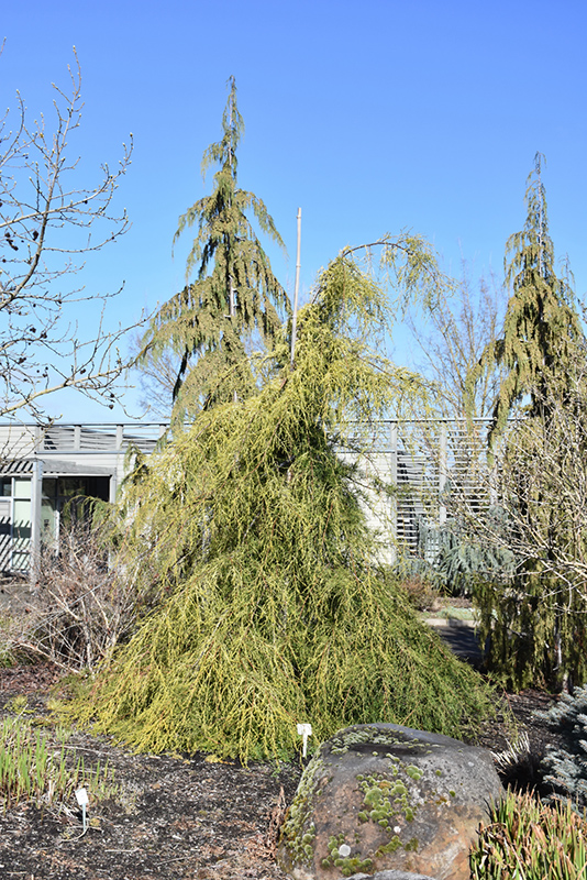 Hardiness Zone: 7b Other Names: syn. Golden Weeping Monterey Cypress Description: An irregularly pyramidal, weeping variety, with beautiful golden threadlike foliage elegantly draped from its branches; tolerant of wind and salt spray; this variety may grow quite large in ideal conditions, but can be maintained by pruning Ornamental Features Coneybear's Weeping Golden Cypress is primarily valued in the landscape for its highly ornamental weeping form. It has attractive gold foliage with hints of green which emerges chartreuse in spring. The threadlike sprays of foliage are highly ornamental and remain gold throughout the winter. Landscape Attributes Coneybear's Weeping Golden Cypress is an open evergreen tree with a strong central leader and a rounded form and gracefully weeping branches. It lends an extremely fine and delicate texture to the landscape composition which can make it a great accent feature on this basis alone. This is a relatively low maintenance tree, and usually looks its best without pruning, although it will tolerate pruning. Deer don't particularly care for this plant and will usually leave it alone in favor of tastier treats. It has no significant negative characteristics. Coneybear's Weeping Golden Cypress is recommended for the following landscape applications; Planting & Growing Coneybear's Weeping Golden Cypress will grow to be about 35 feet tall at maturity, with a spread of 25 feet. It has a low canopy with a typical clearance of 1 foot from the ground, and should not be planted underneath power lines. It grows at a medium rate, and under ideal conditions can be expected to live for 60 years or more. This tree should only be grown in full sunlight. It prefers dry to average moisture levels with very well-drained soil, and will often die in standing water. It is considered to be drought-tolerant, and thus makes an ideal choice for xeriscaping or the moisture-conserving landscape. It is not particular as to soil pH, but grows best in poor soils, and is able to handle environmental salt. It is somewhat tolerant of urban pollution. This is a selection of a native North American species.