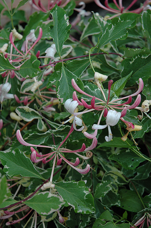 Hardiness Zone: 4a Other Names: Woodbine Honeysuckle Description: A superb variety of our native climber with artistically variegated rich green and white foliage all season long to go with the incredibly fragrant flowers that bloom over a long period; let it climb over an arbor where its scent can be enjoyed Ornamental Features Harlequin Honeysuckle features showy clusters of fragrant white trumpet-shaped flowers with shell pink overtones and yellow throats at the ends of the branches from late spring to mid summer, which emerge from distinctive rose flower buds. It has attractive white-variegated green foliage with hints of pink. The pointy leaves are highly ornamental but do not develop any appreciable fall color. Landscape Attributes Harlequin Honeysuckle is a multi-stemmed deciduous woody vine with a twining and trailing habit of growth. Its average texture blends into the landscape, but can be balanced by one or two finer or coarser trees or shrubs for an effective composition. This woody vine will require occasional maintenance and upkeep, and is best pruned in late winter once the threat of extreme cold has passed. It is a good choice for attracting butterflies and hummingbirds to your yard. It has no significant negative characteristics. Harlequin Honeysuckle is recommended for the following landscape applications; Planting & Growing Harlequin Honeysuckle will grow to be about 20 feet tall at maturity, with a spread of 24 inches. As a climbing vine, it tends to be leggy near the base and should be underplanted with low-growing facer plants. It should be planted near a fence, trellis or other landscape structure where it can be trained to grow upwards on it, or allowed to trail off a retaining wall or slope. It grows at a fast rate, and under ideal conditions can be expected to live for approximately 20 years. This woody vine does best in full sun to partial shade. It does best in average to evenly moist conditions, but will not tolerate standing water. It is not particular as to soil type or pH. It is somewhat tolerant of urban pollution. Consider applying a thick mulch around the root zone in winter to protect it in exposed locations or colder microclimates. This is a selection of a native North American species.