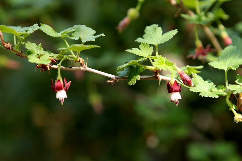Hardiness Zone: 8a Other Names: Grossularia amara, Ribes mariposanum Description: A sprawling deciduous California native shrub that produces dainty burgundy and white flowers that appear along the branches in late winter to spring, followed by sticky, bitter red berries; a vigorous plant, good for dry slopes Ornamental Features Bitter Gooseberry features dainty nodding burgundy bell-shaped flowers with white overtones along the branches from late winter to late spring. It features an abundance of magnificent red berries from early to late summer, which fade to deep purple over time. It has forest green deciduous foliage. The serrated lobed leaves turn outstanding shades of yellow, orange and scarlet in the fall. The spiny gray bark adds an interesting dimension to the landscape. Landscape Attributes Bitter Gooseberry is a multi-stemmed deciduous shrub with an upright spreading habit of growth. Its average texture blends into the landscape, but can be balanced by one or two finer or coarser trees or shrubs for an effective composition. This shrub will require occasional maintenance and upkeep, and should only be pruned after flowering to avoid removing any of the current season's flowers. It is a good choice for attracting birds and butterflies to your yard. Gardeners should be aware of the following characteristic(s) that may warrant special consideration; Bitter Gooseberry is recommended for the following landscape applications; Planting & Growing Bitter Gooseberry will grow to be about 6 feet tall at maturity, with a spread of 5 feet. It tends to be a little leggy, with a typical clearance of 1 foot from the ground, and is suitable for planting under power lines. It grows at a medium rate, and under ideal conditions can be expected to live for approximately 15 years. As this plant tends to go dormant in summer, it is best interplanted with late-season bloomers to hide the dying foliage. This is a self-pollinating variety, so it doesn't require a second plant nearby to set fruit. This shrub performs well in both full sun and full shade. It is very adaptable to both dry and moist growing conditions, but will not tolerate any standing water. It is considered to be drought-tolerant, and thus makes an ideal choice for xeriscaping or the moisture-conserving landscape. This plant does not require much in the way of fertilizing once established. It is not particular as to soil type or pH. It is somewhat tolerant of urban pollution. This species is native to parts of North America.