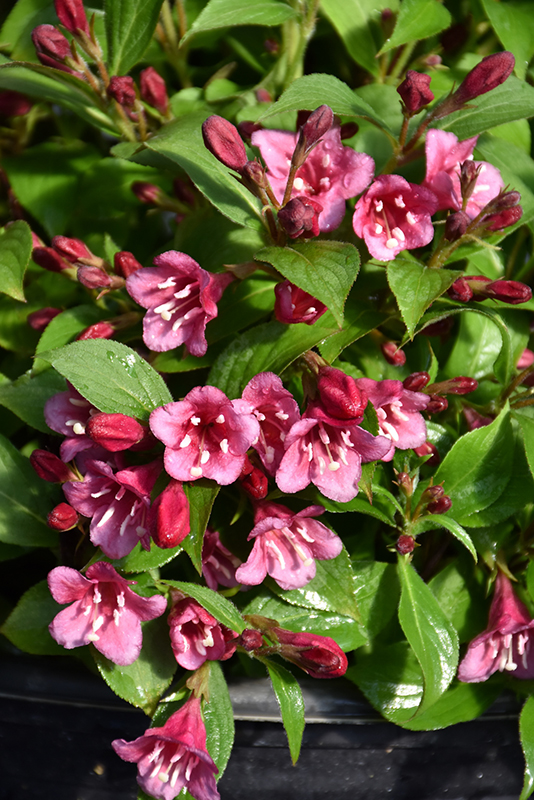 Hardiness Zone: 4a Group/Class: Snippet® Series Brand: Proven Winners Description: This is an extraordinary cultivar that forms a compact rounded shrub with rich glossy green foliage; striking, deep pink trumpet-shaped flowers re-bloom all season and attract hummingbirds; ideal for mixed borders or containers Ornamental Features Snippet® Dark Pink Reblooming Weigela features showy clusters of hot pink trumpet-shaped flowers with white anthers along the branches from late spring to mid fall, which emerge from distinctive crimson flower buds. It has green deciduous foliage. The glossy pointy leaves do not develop any appreciable fall color. Landscape Attributes Snippet® Dark Pink Reblooming Weigela is a dense multi-stemmed deciduous shrub with a more or less rounded form. Its relatively fine texture sets it apart from other landscape plants with less refined foliage. This shrub will require occasional maintenance and upkeep, and should only be pruned after flowering to avoid removing any of the current season's flowers. It is a good choice for attracting hummingbirds to your yard, but is not particularly attractive to deer who tend to leave it alone in favor of tastier treats. It has no significant negative characteristics. Snippet® Dark Pink Reblooming Weigela is recommended for the following landscape applications; Planting & Growing Snippet® Dark Pink Reblooming Weigela will grow to be about 24 inches tall at maturity, with a spread of 24 inches. It tends to fill out right to the ground and therefore doesn't necessarily require facer plants in front. It grows at a medium rate, and under ideal conditions can be expected to live for approximately 30 years. This shrub should only be grown in full sunlight. It prefers to grow in average to moist conditions, and shouldn't be allowed to dry out. To help this plant achive its best flowering performance, periodically apply a flower-boosting fertilizer from early spring through into the active growing season. It is not particular as to soil type or pH. It is highly tolerant of urban pollution and will even thrive in inner city environments. This is a selected variety of a species not originally from North America. Snippet® Dark Pink Reblooming Weigela makes a fine choice for the outdoor landscape, but it is also well-suited for use in outdoor pots and containers. It can be used either as 'filler' or as a 'thriller' in the 'spiller-thriller-filler' container combination, depending on the height and form of the other plants used in the container planting. It is even sizeable enough that it can be grown alone in a suitable container. Note that when grown in a container, it may not perform exactly as indicated on the tag - this is to be expected. Also note that when growing plants in outdoor containers and baskets, they may require more frequent waterings than they would in the yard or garden.