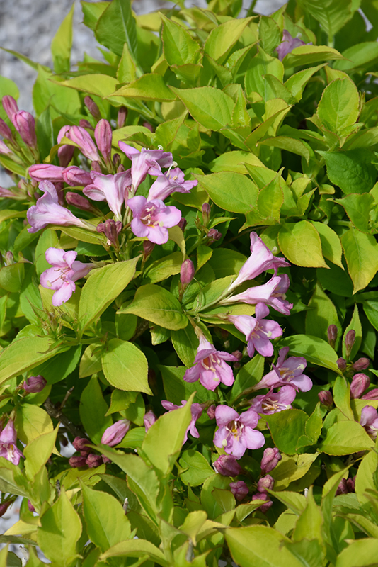 Hardiness Zone: 4a Group/Class: Snippet® Series Brand: Proven Winners Description: This is an extraordinary cultivar that forms a compact rounded shrub with luminous lime green foliage; lovely, shell pink trumpet-shaped flowers re-bloom all season and attract hummingbirds; ideal for mixed borders or containers Ornamental Features Snippet Lime® Reblooming Weigela features showy clusters of shell pink trumpet-shaped flowers with white anthers along the branches from late spring to mid fall, which emerge from distinctive dark red flower buds. It has attractive lime green foliage with hints of chartreuse. The serrated pointy leaves are highly ornamental but do not develop any appreciable fall color. Landscape Attributes Snippet Lime® Reblooming Weigela is a dense multi-stemmed deciduous shrub with a more or less rounded form. Its relatively fine texture sets it apart from other landscape plants with less refined foliage. This shrub will require occasional maintenance and upkeep, and should only be pruned after flowering to avoid removing any of the current season's flowers. It is a good choice for attracting hummingbirds to your yard, but is not particularly attractive to deer who tend to leave it alone in favor of tastier treats. It has no significant negative characteristics. Snippet Lime® Reblooming Weigela is recommended for the following landscape applications; Planting & Growing Snippet Lime® Reblooming Weigela will grow to be about 24 inches tall at maturity, with a spread of 24 inches. It tends to fill out right to the ground and therefore doesn't necessarily require facer plants in front. It grows at a medium rate, and under ideal conditions can be expected to live for approximately 30 years. This shrub should only be grown in full sunlight. It prefers to grow in average to moist conditions, and shouldn't be allowed to dry out. To help this plant achive its best flowering performance, periodically apply a flower-boosting fertilizer from early spring through into the active growing season. It is not particular as to soil type or pH. It is highly tolerant of urban pollution and will even thrive in inner city environments. This is a selected variety of a species not originally from North America. Snippet Lime® Reblooming Weigela makes a fine choice for the outdoor landscape, but it is also well-suited for use in outdoor pots and containers. It can be used either as 'filler' or as a 'thriller' in the 'spiller-thriller-filler' container combination, depending on the height and form of the other plants used in the container planting. It is even sizeable enough that it can be grown alone in a suitable container. Note that when grown in a container, it may not perform exactly as indicated on the tag - this is to be expected. Also note that when growing plants in outdoor containers and baskets, they may require more frequent waterings than they would in the yard or garden.