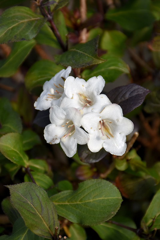 Hardiness Zone: 4a Brand: Proven Winners Description: An elegant selection, featuring green-white trumpet flowers held over dramatic dark foliage in late spring; attracts hummingbirds; a relatively compact shrub, ideal for garden detail use; needs full sun Ornamental Features Wine & Spirits® Weigela features showy clusters of white trumpet-shaped flowers along the branches from late spring to early summer, which emerge from distinctive light green flower buds. It has attractive burgundy-variegated dark green foliage. The pointy leaves are highly ornamental and turn an outstanding deep purple in the fall. The smooth gray bark and dark red branches add an interesting dimension to the landscape. Landscape Attributes Wine & Spirits® Weigela is a multi-stemmed deciduous shrub with an upright spreading habit of growth. Its average texture blends into the landscape, but can be balanced by one or two finer or coarser trees or shrubs for an effective composition. This shrub will require occasional maintenance and upkeep, and should only be pruned after flowering to avoid removing any of the current season's flowers. It is a good choice for attracting hummingbirds to your yard. It has no significant negative characteristics. Wine & Spirits® Weigela is recommended for the following landscape applications; Planting & Growing Wine & Spirits® Weigela will grow to be about 5 feet tall at maturity, with a spread of 5 feet. It tends to fill out right to the ground and therefore doesn't necessarily require facer plants in front, and is suitable for planting under power lines. It grows at a medium rate, and under ideal conditions can be expected to live for approximately 30 years. This shrub should only be grown in full sunlight. It prefers to grow in average to moist conditions, and shouldn't be allowed to dry out. To help this plant achive its best flowering performance, periodically apply a flower-boosting fertilizer from early spring through into the active growing season. It is not particular as to soil type or pH. It is highly tolerant of urban pollution and will even thrive in inner city environments. This is a selected variety of a species not originally from North America. Wine & Spirits® Weigela makes a fine choice for the outdoor landscape, but it is also well-suited for use in outdoor pots and containers. With its upright habit of growth, it is best suited for use as a 'thriller' in the 'spiller-thriller-filler' container combination; plant it near the center of the pot, surrounded by smaller plants and those that spill over the edges. It is even sizeable enough that it can be grown alone in a suitable container. Note that when grown in a container, it may not perform exactly as indicated on the tag - this is to be expected. Also note that when growing plants in outdoor containers and baskets, they may require more frequent waterings than they would in the yard or garden.