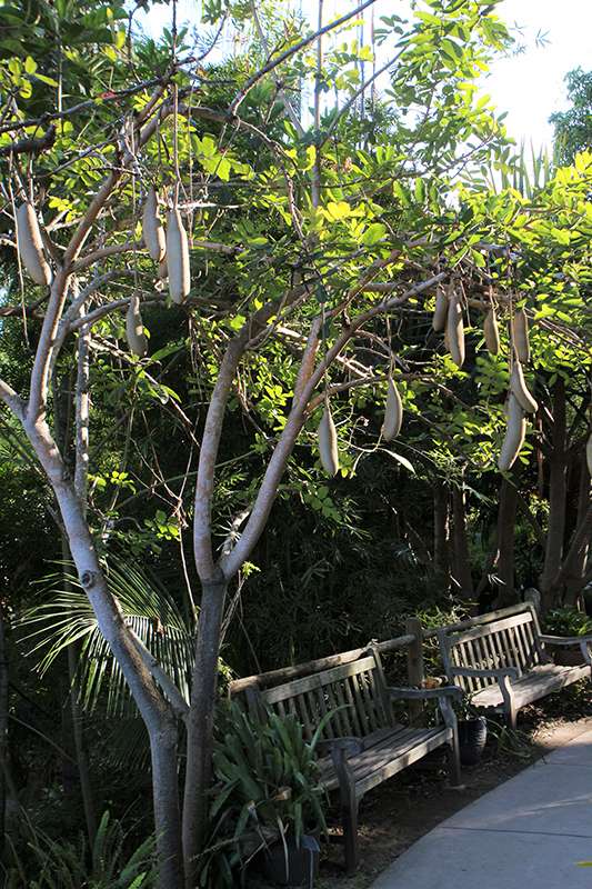 Hardiness Zone: 10a Other Names: syn. Kigelia africana, Cucumber Tree Description: A fast growing tree that quickly forms a canopy; interesting crimson flowers appear on long tendrils in late winter to summer, followed by elongated fruit that look like hanging sausages; deciduous in extended dry conditions; an exotic landscape accent Ornamental Features Sausage Tree features showy panicles of fragrant crimson cup-shaped flowers with yellow anthers hanging below the branches from late winter to early summer. It has attractive forest green evergreen foliage. The large glossy oval pinnately compound leaves are highly ornamental and remain forest green throughout the winter. It features abundant showy tan capsules with brown overtones from early fall to late winter. The fruit can be messy if allowed to drop on the lawn or walkways, and may require occasional clean-up. The smooth gray bark adds an interesting dimension to the landscape. Landscape Attributes Sausage Tree is a multi-stemmed evergreen tree with an upright spreading habit of growth. Its relatively coarse texture can be used to stand it apart from other landscape plants with finer foliage. This is a relatively low maintenance tree, and is best pruned in late winter once the threat of extreme cold has passed. It is a good choice for attracting birds, bees and butterflies to your yard. It has no significant negative characteristics. Sausage Tree is recommended for the following landscape applications; Planting & Growing Sausage Tree will grow to be about 50 feet tall at maturity, with a spread of 30 feet. It has a low canopy with a typical clearance of 4 feet from the ground, and should not be planted underneath power lines. It grows at a fast rate, and under ideal conditions can be expected to live for 60 years or more. This tree does best in full sun to partial shade. It is an amazingly adaptable plant, tolerating both dry conditions and even some standing water. It is considered to be drought-tolerant, and thus makes an ideal choice for xeriscaping or the moisture-conserving landscape. This plant should not require much in the way of fertilizing once established, although it may appreciate a shot of general-purpose fertilizer from time to time early in the growing season. It is not particular as to soil type or pH. It is somewhat tolerant of urban pollution. This species is not originally from North America, and parts of it are known to be toxic to humans and animals, so care should be exercised in planting it around children and pets.