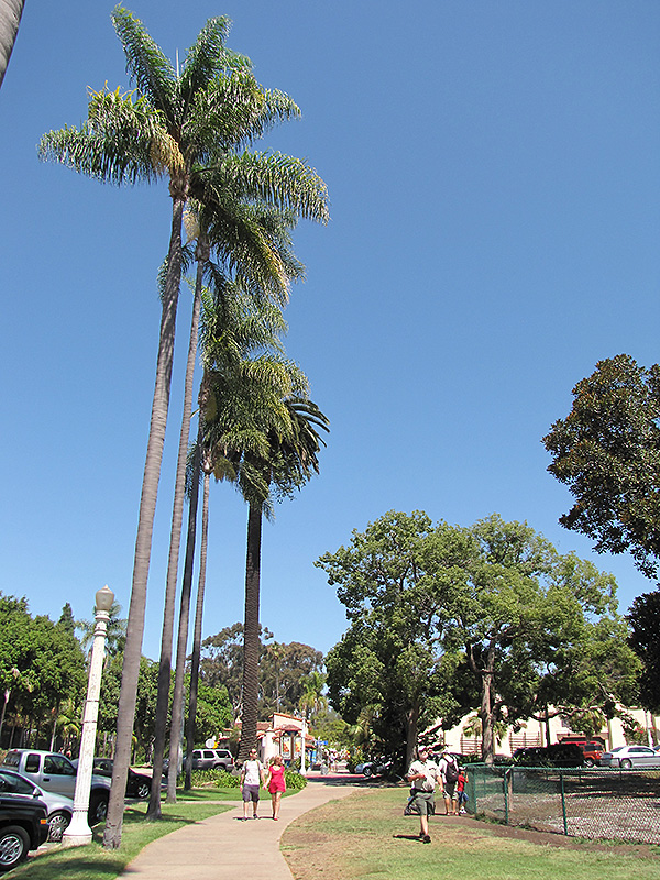 Hardiness Zone: 10a Other Names: Imperial Palm Description: A magnificent, massive palm with a tall column-like trunk topped with a superb green crownshaft, supporting attractive, upswept feather-like green leaves; a wonderful vertical accent tree in warm urban landscapes Ornamental Features Caribbean Royal Palm has attractive dark green evergreen foliage on a tree with the bulk of the canopy held atop a towering trunk or stem. The large narrow pinnately compound leaves are highly ornamental and remain dark green throughout the winter. It has masses of beautiful panicles of creamy white flowers hanging below the branches from late winter to early spring, which are most effective when planted in groupings. However, the fruit can be messy in the landscape and may require occasional clean-up. The smooth gray bark is extremely showy and adds significant winter interest. Landscape Attributes Caribbean Royal Palm is an open evergreen tree with a strong central leader and a towering form, with a high canopy of foliage concentrated at the top of the plant. Its average texture blends into the landscape, but can be balanced by one or two finer or coarser trees or shrubs for an effective composition. This is a relatively low maintenance tree, and usually looks its best without pruning, although it will tolerate pruning. It is a good choice for attracting birds to your yard. It has no significant negative characteristics. Caribbean Royal Palm is recommended for the following landscape applications; Planting & Growing Caribbean Royal Palm will grow to be about 100 feet tall at maturity, with a spread of 15 feet. It has a high canopy of foliage that sits well above the ground, and should not be planted underneath power lines. As it matures, the lower branches of this tree can be strategically removed to create a high enough canopy to support unobstructed human traffic underneath. It grows at a medium rate, and under ideal conditions can be expected to live to a ripe old age of 150 years or more; think of this as a heritage tree for future generations! This tree should only be grown in full sunlight. It prefers to grow in moist to wet soil, and will even tolerate some standing water. This plant should not require much in the way of fertilizing once established, although it may appreciate a shot of general-purpose fertilizer from time to time early in the growing season. It is not particular as to soil pH, but grows best in rich soils, and is able to handle environmental salt. It is highly tolerant of urban pollution and will even thrive in inner city environments. This species is not originally from North America.