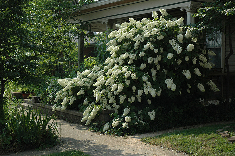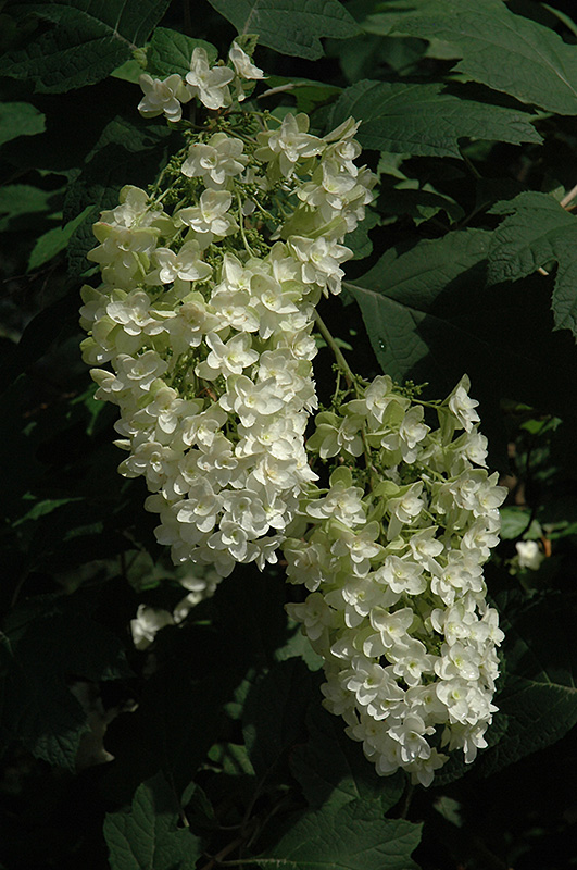 Hardiness Zone: 4b Other Names: Oak Leaf Hydrangea Description: A vastly improved compact form of oakleaf hydrangea that features unique double florets on the sterile flowers, resulting in denser flower heads that bloom over a longer period of time; conical white flower clusters age to pink, dazzling red fall colors Ornamental Features Snowflake Hydrangea features bold fragrant conical double white flowers with pink overtones at the ends of the branches from early to late summer. The flowers are excellent for cutting. It has emerald green deciduous foliage. The large fuzzy lobed leaves turn an outstanding burgundy in the fall. The peeling brick red bark adds an interesting dimension to the landscape. Landscape Attributes Snowflake Hydrangea is a multi-stemmed deciduous shrub with a more or less rounded form. Its relatively coarse texture can be used to stand it apart from other landscape plants with finer foliage. This is a relatively low maintenance shrub, and is best pruned in late winter once the threat of extreme cold has passed. It has no significant negative characteristics. Snowflake Hydrangea is recommended for the following landscape applications; Planting & Growing Snowflake Hydrangea will grow to be about 6 feet tall at maturity, with a spread of 6 feet. It tends to fill out right to the ground and therefore doesn't necessarily require facer plants in front, and is suitable for planting under power lines. It grows at a slow rate, and under ideal conditions can be expected to live for approximately 30 years. This shrub performs well in both full sun and full shade. It prefers to grow in average to moist conditions, and shouldn't be allowed to dry out. It is not particular as to soil type or pH. It is somewhat tolerant of urban pollution, and will benefit from being planted in a relatively sheltered location. Consider applying a thick mulch around the root zone in winter to protect it in exposed locations or colder microclimates. This is a selection of a native North American species.