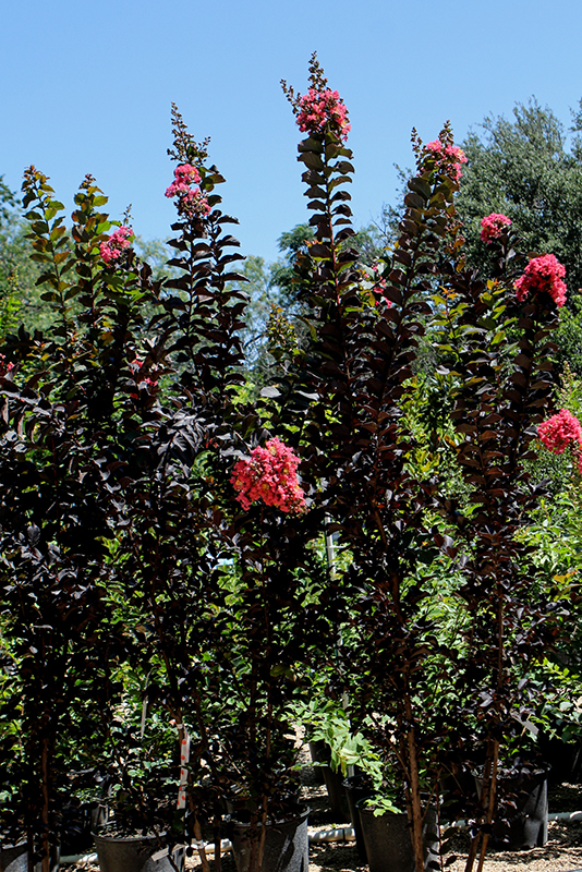 Hardiness Zone: 6b Other Names: Crape Myrtle, Crepe Myrtle Group/Class: Thunderstruck Series Brand: Greenleaf Nursery Description: This spectacular ornamental shrub or small tree is covered in rich coral blooms in summer, over contrasting near-black, glossy foliage; a captivating focal point for the garden or border Ornamental Features Thunderstruck™ Coral Boom™ Crapemyrtle is clothed in stunning panicles of coral-pink frilly flowers with red overtones at the ends of the branches from early summer to early fall. It has attractive burgundy foliage with hints of black. The oval leaves are highly ornamental and turn dark red in fall. Landscape Attributes Thunderstruck™ Coral Boom™ Crapemyrtle is a dense multi-stemmed deciduous shrub with an upright spreading habit of growth. Its relatively fine texture sets it apart from other landscape plants with less refined foliage. This is a relatively low maintenance shrub, and is best pruned in late winter once the threat of extreme cold has passed. It has no significant negative characteristics. Thunderstruck™ Coral Boom™ Crapemyrtle is recommended for the following landscape applications; Planting & Growing Thunderstruck™ Coral Boom™ Crapemyrtle will grow to be about 15 feet tall at maturity, with a spread of 12 feet. It has a low canopy with a typical clearance of 2 feet from the ground, and is suitable for planting under power lines. It grows at a fast rate, and under ideal conditions can be expected to live for 50 years or more. This shrub does best in full sun to partial shade. It prefers to grow in average to moist conditions, and shouldn't be allowed to dry out. To help this plant achive its best flowering performance, periodically apply a flower-boosting fertilizer from early spring through into the active growing season. It is very fussy about its soil conditions and must have rich, acidic soils to ensure success, and is subject to chlorosis (yellowing) of the foliage in alkaline soils. It is highly tolerant of urban pollution and will even thrive in inner city environments. This particular variety is an interspecific hybrid.