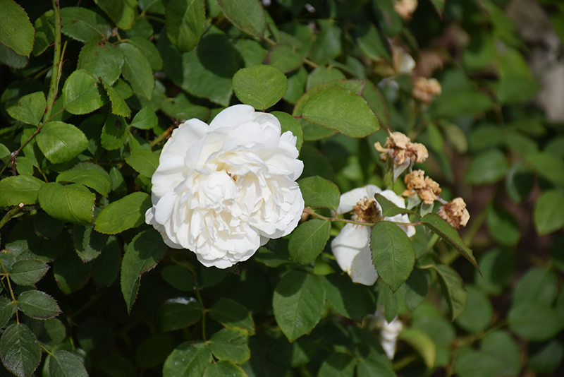 Hardiness Zone: 4b Other Names: Winchester Cathedral Group/Class: Austin Rose Description: A lovely elegant variety with snowy white blooms with occasionally the slightest touch of shell pink at the center; the effect is tremendous, with a mass of flowers held on a full bushy shrub, blooming at regular intervals all season Ornamental Features White Mary Rose features showy fragrant double white flowers at the ends of the branches from late spring to late summer. The flowers are excellent for cutting. It has dark green deciduous foliage. The oval compound leaves turn yellow in fall. Landscape Attributes White Mary Rose is a multi-stemmed deciduous shrub with an upright spreading habit of growth. Its average texture blends into the landscape, but can be balanced by one or two finer or coarser trees or shrubs for an effective composition. This is a high maintenance shrub that will require regular care and upkeep, and is best pruned in late winter once the threat of extreme cold has passed. Gardeners should be aware of the following characteristic(s) that may warrant special consideration; White Mary Rose is recommended for the following landscape applications; Planting & Growing White Mary Rose will grow to be about 4 feet tall at maturity, with a spread of 4 feet. It tends to fill out right to the ground and therefore doesn't necessarily require facer plants in front. It grows at a fast rate, and under ideal conditions can be expected to live for approximately 20 years. This shrub should only be grown in full sunlight. It does best in average to evenly moist conditions, but will not tolerate standing water. It is not particular as to soil type or pH. It is highly tolerant of urban pollution and will even thrive in inner city environments. This particular variety is an interspecific hybrid.