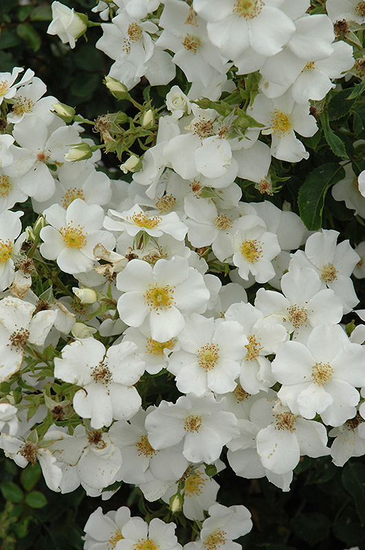Hardiness Zone: 4b Group/Class: Shrub Rose Description: When it comes to easy roses to grow, this is among the lowest maintenance of all, with extremely disease resistant foliage; single flowers are the purest white, borne in tremendous quantities; all roses need full sun and well-drained soil Ornamental Features Starry Night Rose is bathed in stunning white flowers with yellow eyes at the ends of the branches from late spring to late summer. The flowers are excellent for cutting. It has dark green deciduous foliage. The oval compound leaves turn yellow in fall. Landscape Attributes Starry Night Rose is a multi-stemmed deciduous shrub with an upright spreading habit of growth. Its average texture blends into the landscape, but can be balanced by one or two finer or coarser trees or shrubs for an effective composition. This shrub will require occasional maintenance and upkeep, and is best pruned in late winter once the threat of extreme cold has passed. Gardeners should be aware of the following characteristic(s) that may warrant special consideration; Starry Night Rose is recommended for the following landscape applications; Planting & Growing Starry Night Rose will grow to be about 4 feet tall at maturity, with a spread of 4 feet. It tends to fill out right to the ground and therefore doesn't necessarily require facer plants in front. It grows at a fast rate, and under ideal conditions can be expected to live for approximately 20 years. This shrub should only be grown in full sunlight. It does best in average to evenly moist conditions, but will not tolerate standing water. It is not particular as to soil type or pH. It is highly tolerant of urban pollution and will even thrive in inner city environments. This particular variety is an interspecific hybrid.