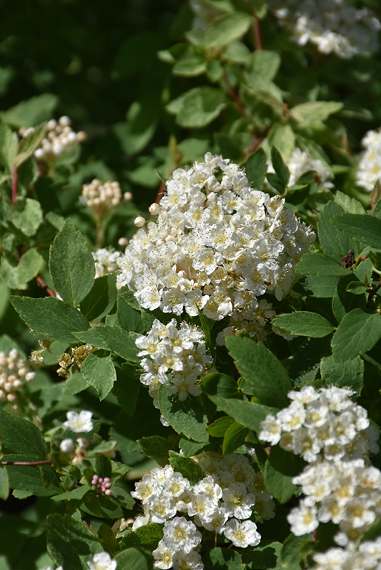 Hardiness Zone: 4a Other Names: Bridalwreath Spirea Description: A truly different twist on this old favorite, with delicate pink new leaves that fade to green mottled with splotches of white on pinkish stems, snowy white flowers sit in masses atop the branches in spring; this compact shrub is a real attention-getter Ornamental Features Pink Ice Spirea is blanketed in stunning white flowers held atop the branches from mid to late spring. It has white-spotted green foliage which emerges pink in spring. The small serrated lobed leaves do not develop any appreciable fall color. The smooth brown bark and pink branches add an interesting dimension to the landscape. Landscape Attributes Pink Ice Spirea is a multi-stemmed deciduous shrub with a shapely form and gracefully arching branches. Its relatively fine texture sets it apart from other landscape plants with less refined foliage. This is a relatively low maintenance shrub, and should only be pruned after flowering to avoid removing any of the current season's flowers. It is a good choice for attracting butterflies to your yard, but is not particularly attractive to deer who tend to leave it alone in favor of tastier treats. It has no significant negative characteristics. Pink Ice Spirea is recommended for the following landscape applications; Planting & Growing Pink Ice Spirea will grow to be about 4 feet tall at maturity, with a spread of 5 feet. It tends to fill out right to the ground and therefore doesn't necessarily require facer plants in front. It grows at a medium rate, and under ideal conditions can be expected to live for approximately 20 years. This shrub should only be grown in full sunlight. It prefers to grow in average to moist conditions, and shouldn't be allowed to dry out. It is not particular as to soil type or pH. It is highly tolerant of urban pollution and will even thrive in inner city environments. This particular variety is an interspecific hybrid.