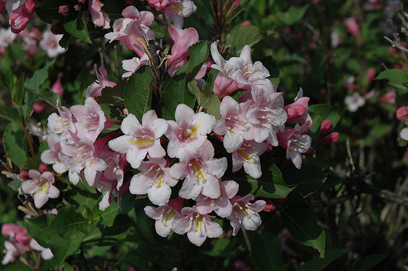 Hardiness Zone: 3b Description: A neat and compact flowering shrub covered in soft pink flowers with deeper pink bases, attractive to hummingbirds, foliage emerges with a copper tint fading to a deep dark green; rather reserved the rest of the year, needs full sun Ornamental Features Samba Weigela features showy clusters of shell pink trumpet-shaped flowers with yellow throats and a rose reverse along the branches from late spring to mid summer. It has attractive purple-tipped dark green foliage which emerges coppery-bronze in spring. The pointy leaves are highly ornamental but do not develop any appreciable fall color. Landscape Attributes Samba Weigela is a multi-stemmed deciduous shrub with a more or less rounded form. Its average texture blends into the landscape, but can be balanced by one or two finer or coarser trees or shrubs for an effective composition. This shrub will require occasional maintenance and upkeep, and should only be pruned after flowering to avoid removing any of the current season's flowers. It is a good choice for attracting hummingbirds to your yard. It has no significant negative characteristics. Samba Weigela is recommended for the following landscape applications; Planting & Growing Samba Weigela will grow to be about 3 feet tall at maturity, with a spread of 3 feet. It has a low canopy. It grows at a medium rate, and under ideal conditions can be expected to live for approximately 30 years. This shrub should only be grown in full sunlight. It prefers to grow in average to moist conditions, and shouldn't be allowed to dry out. It is not particular as to soil type or pH. It is highly tolerant of urban pollution and will even thrive in inner city environments. This is a selected variety of a species not originally from North America. Samba Weigela makes a fine choice for the outdoor landscape, but it is also well-suited for use in outdoor pots and containers. Because of its height, it is often used as a 'thriller' in the 'spiller-thriller-filler' container combination; plant it near the center of the pot, surrounded by smaller plants and those that spill over the edges. It is even sizeable enough that it can be grown alone in a suitable container. Note that when grown in a container, it may not perform exactly as indicated on the tag - this is to be expected. Also note that when growing plants in outdoor containers and baskets, they may require more frequent waterings than they would in the yard or garden.