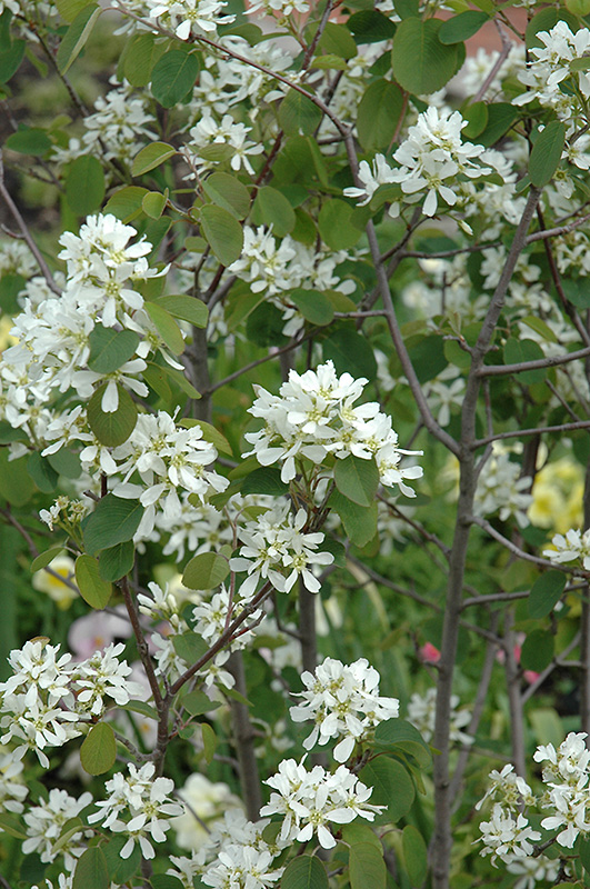 Hardiness Zone: 4b Other Names: Juneberry, Shadbush, Snowy Mespilus Description: A dense and compact garden shrub with branches smothered in clusters of pretty star-shaped white flowers in spring; dark red berries are loved by the birds Ornamental Features Helvetica Serviceberry is primarily grown for its highly ornamental fruit. It features an abundance of magnificent deep purple berries from late spring to early summer. It is blanketed in stunning racemes of creamy white flowers rising above the foliage from mid to late spring before the leaves. It has dark green deciduous foliage which emerges red in spring. The oval leaves turn an outstanding yellow in the fall. Landscape Attributes Helvetica Serviceberry is a dense multi-stemmed deciduous shrub with a more or less rounded form. Its average texture blends into the landscape, but can be balanced by one or two finer or coarser trees or shrubs for an effective composition. This is a relatively low maintenance shrub, and is best pruned in late winter once the threat of extreme cold has passed. It is a good choice for attracting birds to your yard, but is not particularly attractive to deer who tend to leave it alone in favor of tastier treats. It has no significant negative characteristics. Helvetica Serviceberry is recommended for the following landscape applications; Planting & Growing Helvetica Serviceberry will grow to be about 5 feet tall at maturity, with a spread of 5 feet. It tends to fill out right to the ground and therefore doesn't necessarily require facer plants in front, and is suitable for planting under power lines. It grows at a medium rate, and under ideal conditions can be expected to live for approximately 30 years. This is a self-pollinating variety, so it doesn't require a second plant nearby to set fruit. This shrub does best in full sun to partial shade. It prefers to grow in average to moist conditions, and shouldn't be allowed to dry out. It is not particular as to soil type or pH. It is somewhat tolerant of urban pollution. This is a selection of a native North American species.