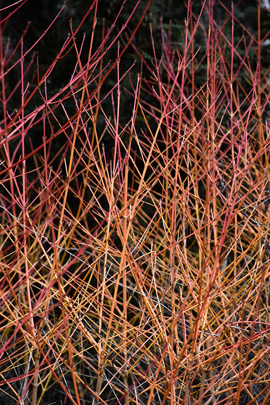 Hardiness Zone: 4b Other Names: Winter Flame Bloodtwig Dogwood Description: A highly ornamental shrub characterized by bright yellow stems that are tipped with red twigs, fall color is gold tinged with red, attractive flowers and fruit; a fine choice for winter landscapes Ornamental Features Midwinter Fire Dogwood has clusters of creamy white flowers at the ends of the branches in late spring. It has green deciduous foliage. The glossy oval leaves turn an outstanding gold in the fall. It produces deep purple berries in late summer. The red bark and harvest gold branches are extremely showy and add significant winter interest. Landscape Attributes Midwinter Fire Dogwood is a dense multi-stemmed deciduous shrub with a more or less rounded form. Its average texture blends into the landscape, but can be balanced by one or two finer or coarser trees or shrubs for an effective composition. This shrub will require occasional maintenance and upkeep, and is best pruned in late winter once the threat of extreme cold has passed. It is a good choice for attracting birds to your yard. Gardeners should be aware of the following characteristic(s) that may warrant special consideration; Midwinter Fire Dogwood is recommended for the following landscape applications; Planting & Growing Midwinter Fire Dogwood will grow to be about 5 feet tall at maturity, with a spread of 5 feet. It tends to fill out right to the ground and therefore doesn't necessarily require facer plants in front, and is suitable for planting under power lines. It grows at a medium rate, and under ideal conditions can be expected to live for approximately 20 years. This shrub does best in full sun to partial shade. It prefers to grow in average to moist conditions, and shouldn't be allowed to dry out. It is not particular as to soil type or pH. It is highly tolerant of urban pollution and will even thrive in inner city environments. This is a selected variety of a species not originally from North America.