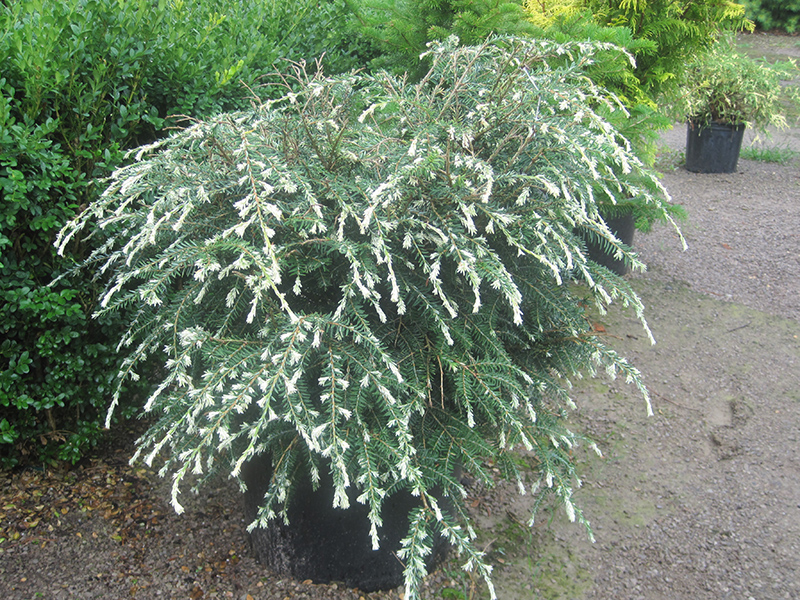 Hardiness Zone: 4a Other Names: Canadian Hemlock, Eastern Hemlock Description: A stately hemlock that can be cultivated as a shrub or allowed to grow to commanding proportions; its white tipped needles add tremendous interest especially on close inspection, truly distinctive Ornamental Features Albospica Hemlock is primarily valued in the landscape for its distinctively pyramidal habit of growth. It has attractive white-tipped dark green foliage which emerges light green in spring. The needles are highly ornamental and remain dark green throughout the winter. Landscape Attributes Albospica Hemlock is a multi-stemmed evergreen tree with a distinctive and refined pyramidal form. Its relatively fine texture sets it apart from other landscape plants with less refined foliage. This tree will require occasional maintenance and upkeep, and is best pruned in late winter once the threat of extreme cold has passed. Gardeners should be aware of the following characteristic(s) that may warrant special consideration; Albospica Hemlock is recommended for the following landscape applications; Planting & Growing Albospica Hemlock will grow to be about 25 feet tall at maturity, with a spread of 15 feet. It has a low canopy with a typical clearance of 1 foot from the ground, and is suitable for planting under power lines. It grows at a slow rate, and under ideal conditions can be expected to live for 60 years or more. This tree performs well in both full sun and full shade. It does best in average to evenly moist conditions, but will not tolerate standing water. It is not particular as to soil type, but has a definite preference for acidic soils. It is quite intolerant of urban pollution, therefore inner city or urban streetside plantings are best avoided, and will benefit from being planted in a relatively sheltered location. Consider applying a thick mulch around the root zone in winter to protect it in exposed locations or colder microclimates. This is a selection of a native North American species.