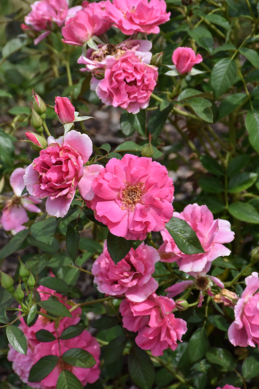 Hardiness Zone: 3b Group/Class: Shrub Rose Description: Dependable for bright full displays right into the frosty weather; beautiful deep pink blooms are elegantly ruffled for a delicate look; commonly has up to fifty flirty blooms in large clusters; highly disease resistant and surprisingly hardy Ornamental Features Ruffled Cloud Rose is draped in stunning fragrant semi-double hot pink flowers with yellow eyes at the ends of the branches from late spring to late fall. The flowers are excellent for cutting. It has dark green deciduous foliage. The glossy oval compound leaves do not develop any appreciable fall color. The fruits are showy red hips displayed from early to late fall. Landscape Attributes Ruffled Cloud Rose is a multi-stemmed deciduous shrub with an upright spreading habit of growth. Its average texture blends into the landscape, but can be balanced by one or two finer or coarser trees or shrubs for an effective composition. This shrub will require occasional maintenance and upkeep, and is best pruned in late winter once the threat of extreme cold has passed. Gardeners should be aware of the following characteristic(s) that may warrant special consideration; Ruffled Cloud Rose is recommended for the following landscape applications; Planting & Growing Ruffled Cloud Rose will grow to be about 4 feet tall at maturity, with a spread of 3 feet. It tends to fill out right to the ground and therefore doesn't necessarily require facer plants in front. It grows at a fast rate, and under ideal conditions can be expected to live for approximately 20 years. This shrub should only be grown in full sunlight. It does best in average to evenly moist conditions, but will not tolerate standing water. It is not particular as to soil type or pH. It is somewhat tolerant of urban pollution. This particular variety is an interspecific hybrid.