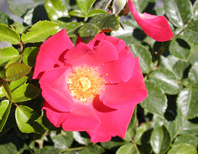 Hardiness Zone: 4a Group/Class: Easy Elegance Rose Description: A stunning eye-catching shrub rose with luminescent reddish orange petals with a bright golden eye that shines above the deep green foliage; multiple clusters of blossoms come up constantly creating a tremendous effect that is hard to rival Ornamental Features Golden Eye Rose is clothed in stunning fragrant crimson flowers with gold eyes at the ends of the branches from late spring to early fall. The flowers are excellent for cutting. It has dark green deciduous foliage. The glossy oval compound leaves do not develop any appreciable fall color. The fruits are showy red hips displayed in late fall. Landscape Attributes Golden Eye Rose is a multi-stemmed deciduous shrub with an upright spreading habit of growth. Its average texture blends into the landscape, but can be balanced by one or two finer or coarser trees or shrubs for an effective composition. This is a high maintenance shrub that will require regular care and upkeep, and is best pruned in late winter once the threat of extreme cold has passed. Gardeners should be aware of the following characteristic(s) that may warrant special consideration; Golden Eye Rose is recommended for the following landscape applications; Planting & Growing Golden Eye Rose will grow to be about 5 feet tall at maturity, with a spread of 4 feet. It tends to fill out right to the ground and therefore doesn't necessarily require facer plants in front, and is suitable for planting under power lines. It grows at a fast rate, and under ideal conditions can be expected to live for approximately 20 years. This shrub should only be grown in full sunlight. It does best in average to evenly moist conditions, but will not tolerate standing water. It is not particular as to soil type or pH. It is somewhat tolerant of urban pollution. This particular variety is an interspecific hybrid.