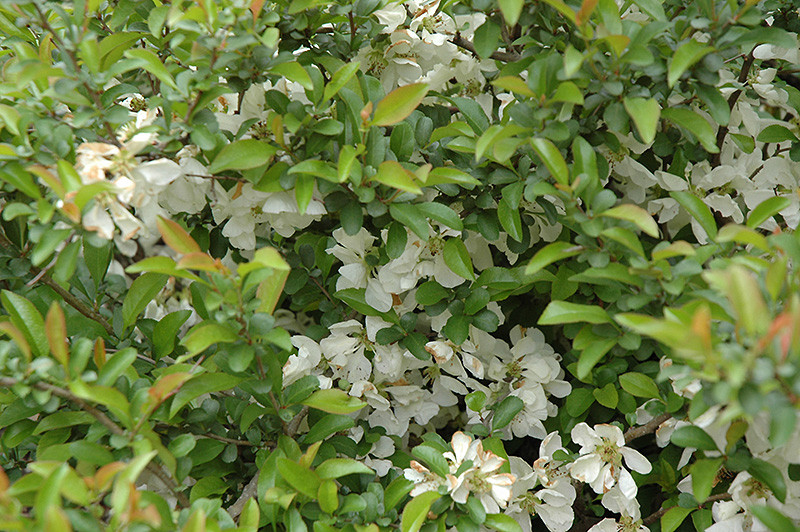 Hardiness Zone: 5a Other Names: Common Quince Description: A compact shrub with showy white flowers in spring, a profuse bloomer; a single-season plant, good for general garden use; more refined than the species Ornamental Features Jet Trail Flowering Quince has white cup-shaped flowers along the branches in early spring before the leaves. It has dark green deciduous foliage which emerges red in spring. The glossy oval leaves do not develop any appreciable fall color. The fruits are showy yellow pomes displayed in mid fall. The fruit can be messy if allowed to drop on the lawn or walkways, and may require occasional clean-up. This plant is primarily grown as an ornamental, but it's also valued for its edible qualities. The bitter fruit is most often used in the following ways: Landscape Attributes Jet Trail Flowering Quince is a dense multi-stemmed deciduous shrub with a more or less rounded form. Its average texture blends into the landscape, but can be balanced by one or two finer or coarser trees or shrubs for an effective composition. This is a high maintenance shrub that will require regular care and upkeep, and should only be pruned after flowering to avoid removing any of the current season's flowers. Gardeners should be aware of the following characteristic(s) that may warrant special consideration; Jet Trail Flowering Quince is recommended for the following landscape applications; Planting & Growing Jet Trail Flowering Quince will grow to be about 4 feet tall at maturity, with a spread of 4 feet. It tends to fill out right to the ground and therefore doesn't necessarily require facer plants in front. It grows at a medium rate, and under ideal conditions can be expected to live for 40 years or more. This shrub should only be grown in full sunlight. It is very adaptable to both dry and moist locations, and should do just fine under average home landscape conditions. It is not particular as to soil type or pH. It is highly tolerant of urban pollution and will even thrive in inner city environments. This particular variety is an interspecific hybrid.