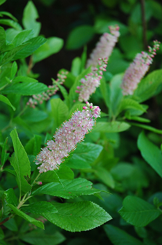 Hardiness Zone: 4a Other Names: Sweet Pepperbush Description: This variety of this highly fragrant native shrub features spikes of sweetly scented light pink flowers in late summer when little else is blooming; neat, tidy habit of growth and good fall color; needs moist acidic soil Ornamental Features Pink Spires Summersweet has masses of beautiful spikes of fragrant rose flowers rising above the foliage from mid to late summer, which are most effective when planted in groupings. It has green deciduous foliage. The glossy round leaves turn an outstanding harvest gold in the fall. Landscape Attributes Pink Spires Summersweet is a multi-stemmed deciduous shrub with a shapely oval form. Its average texture blends into the landscape, but can be balanced by one or two finer or coarser trees or shrubs for an effective composition. This shrub will require occasional maintenance and upkeep, and is best pruned in late winter once the threat of extreme cold has passed. It is a good choice for attracting bees and butterflies to your yard. Gardeners should be aware of the following characteristic(s) that may warrant special consideration; Pink Spires Summersweet is recommended for the following landscape applications; Planting & Growing Pink Spires Summersweet will grow to be about 8 feet tall at maturity, with a spread of 6 feet. It tends to fill out right to the ground and therefore doesn't necessarily require facer plants in front, and is suitable for planting under power lines. It grows at a slow rate, and under ideal conditions can be expected to live for approximately 30 years. This shrub does best in full sun to partial shade. It is quite adaptable, prefering to grow in average to wet conditions, and will even tolerate some standing water. It is not particular as to soil type, but has a definite preference for acidic soils, and is able to handle environmental salt. It is highly tolerant of urban pollution and will even thrive in inner city environments. Consider applying a thick mulch around the root zone in winter to protect it in exposed locations or colder microclimates. This is a selection of a native North American species.