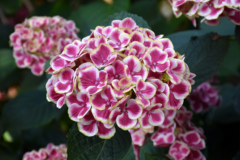 Hardiness Zone: 5b Other Names: French Hydrangea, Bigleaf Hydrangea Description: A beautiful, big-leaf hydrangea with large, mophead flowers that are deep pink and white bicolor; the globe-shaped flowers bloom all summer long, somewhat coarse leaves turn burgundy in fall; blooms on old wood Ornamental Features Buttons 'N Bows® Hydrangea features bold balls of hot pink flowers with white overtones and pink edges at the ends of the branches from mid summer to early fall. The flowers are excellent for cutting. It has forest green deciduous foliage. The glossy pointy leaves turn an outstanding burgundy in the fall. Landscape Attributes Buttons 'N Bows® Hydrangea is a multi-stemmed deciduous shrub with a more or less rounded form. Its relatively coarse texture can be used to stand it apart from other landscape plants with finer foliage. This shrub will require occasional maintenance and upkeep, and should only be pruned after flowering to avoid removing any of the current season's flowers. It has no significant negative characteristics. Buttons 'N Bows® Hydrangea is recommended for the following landscape applications; Planting & Growing Buttons 'N Bows® Hydrangea will grow to be about 4 feet tall at maturity, with a spread of 4 feet. It tends to be a little leggy, with a typical clearance of 1 foot from the ground. It grows at a fast rate, and under ideal conditions can be expected to live for approximately 20 years. This shrub does best in full sun to partial shade. You may want to keep it away from hot, dry locations that receive direct afternoon sun or which get reflected sunlight, such as against the south side of a white wall. It requires an evenly moist well-drained soil for optimal growth. It is not particular as to soil type, but has a definite preference for acidic soils. It is highly tolerant of urban pollution and will even thrive in inner city environments, and will benefit from being planted in a relatively sheltered location. Consider applying a thick mulch around the root zone in both summer and winter to conserve soil moisture and protect it in exposed locations or colder microclimates. This is a selected variety of a species not originally from North America. Buttons 'N Bows® Hydrangea makes a fine choice for the outdoor landscape, but it is also well-suited for use in outdoor pots and containers. Because of its height, it is often used as a 'thriller' in the 'spiller-thriller-filler' container combination; plant it near the center of the pot, surrounded by smaller plants and those that spill over the edges. It is even sizeable enough that it can be grown alone in a suitable container. Note that when grown in a container, it may not perform exactly as indicated on the tag - this is to be expected. Also note that when growing plants in outdoor containers and baskets, they may require more frequent waterings than they would in the yard or garden.