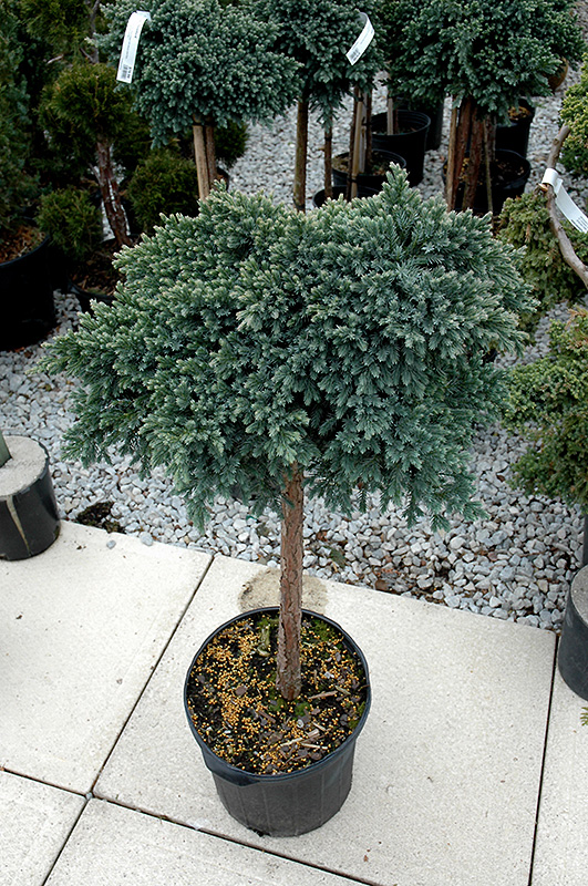 Hardiness Zone: 4a Other Names: Singleseed Juniper Description: A highly ornamental form of this juniper trained to grow on a single trunk; foliage is a dense, silvery blue ball, needles are radially arranged around the branches, giving the appearance of stars; an excellent color and interest accent for the garden Ornamental Features Blue Star Juniper is primarily valued in the landscape or garden for its highly ornamental lollipop-like shape. It has attractive blue evergreen foliage which emerges silvery blue in spring. The needles are highly ornamental and remain blue throughout the winter. Landscape Attributes Blue Star Juniper is a dense evergreen dwarf tree, selected and trained to grow in a small tree-like form with the primary plant grafted high atop a standard. It lends an extremely fine and delicate texture to the landscape composition which can make it a great accent feature on this basis alone. This dwarf tree will require occasional maintenance and upkeep, and is best pruned in late winter once the threat of extreme cold has passed. It has no significant negative characteristics. Blue Star Juniper is ideal for use as a garden accent or patio feature, and is recommended for the following landscape applications; Planting & Growing Blue Star Juniper will grow to be about 6 feet tall at maturity, with a spread of 3 feet. It tends to be a little leggy, with a typical clearance of 2 feet from the ground, and is suitable for planting under power lines. It grows at a slow rate, and under ideal conditions can be expected to live for approximately 30 years. This dwarf tree should only be grown in full sunlight. It is very adaptable to both dry and moist growing conditions, but will not tolerate any standing water. It is considered to be drought-tolerant, and thus makes an ideal choice for xeriscaping or the moisture-conserving landscape. It is not particular as to soil type or pH. It is highly tolerant of urban pollution and will even thrive in inner city environments. This is a selected variety of a species not originally from North America.