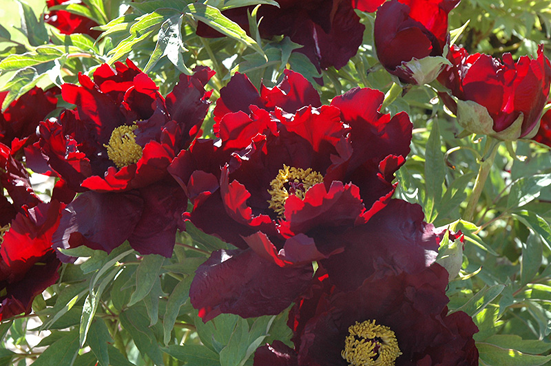 Hardiness Zone: 4a Description: A beautiful woody peony, with bold flowers in a rich dark red with prominent yellow stamens, great as an accent in the garden or massed along borders; unlike perennial peonies, remember not to prune this variety Ornamental Features Boreas Tree Peony features bold lightly-scented semi-double dark red flowers with black eyes and yellow centers at the ends of the branches from mid to late spring. The flowers are excellent for cutting. It has green deciduous foliage. The narrow compound leaves do not develop any appreciable fall color. Landscape Attributes Boreas Tree Peony is a multi-stemmed deciduous shrub with an upright spreading habit of growth. Its relatively fine texture sets it apart from other landscape plants with less refined foliage. This is a relatively low maintenance shrub, and should not require much pruning, except when necessary, such as to remove dieback. It is a good choice for attracting butterflies to your yard, but is not particularly attractive to deer who tend to leave it alone in favor of tastier treats. It has no significant negative characteristics. Boreas Tree Peony is recommended for the following landscape applications; Planting & Growing Boreas Tree Peony will grow to be about 5 feet tall at maturity, with a spread of 5 feet. It has a low canopy, and is suitable for planting under power lines. It grows at a slow rate, and under ideal conditions can be expected to live for approximately 20 years. This shrub does best in full sun to partial shade. It does best in average to evenly moist conditions, but will not tolerate standing water. It is not particular as to soil pH, but grows best in rich soils. It is quite intolerant of urban pollution, therefore inner city or urban streetside plantings are best avoided. Consider applying a thick mulch around the root zone in winter to protect it in exposed locations or colder microclimates. This is a selected variety of a species not originally from North America.