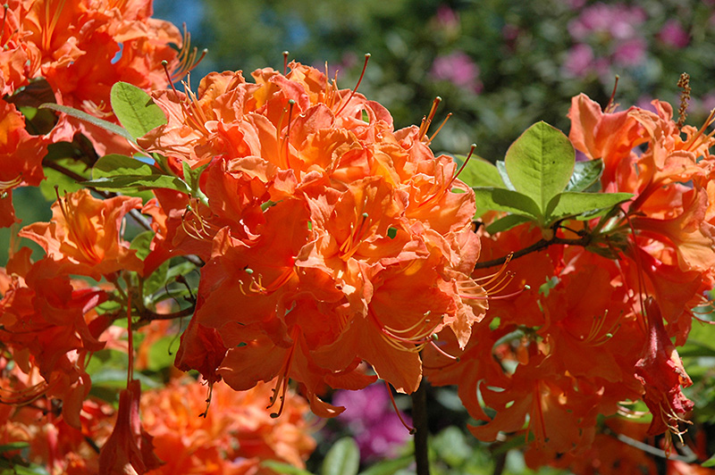 Hardiness Zone: 5a Group/Class: Exbury Hybrids Description: A stunning variety with extraordinary orange blooms that cover the branches in mid spring; showy when massed in a border; absolutely must have well-drained, highly acidic and organic soil, use plenty of peat moss when planting Ornamental Features John F. Kennedy Azalea is covered in stunning clusters of lightly-scented orange trumpet-shaped flowers at the ends of the branches in mid spring before the leaves. It has green deciduous foliage. The narrow leaves turn an outstanding red in the fall. Landscape Attributes John F. Kennedy Azalea is an open multi-stemmed deciduous shrub with an upright spreading habit of growth. Its relatively coarse texture can be used to stand it apart from other landscape plants with finer foliage. This is a relatively low maintenance shrub, and should only be pruned after flowering to avoid removing any of the current season's flowers. It has no significant negative characteristics. John F. Kennedy Azalea is recommended for the following landscape applications; Planting & Growing John F. Kennedy Azalea will grow to be about 5 feet tall at maturity, with a spread of 5 feet. It tends to be a little leggy, with a typical clearance of 1 foot from the ground, and is suitable for planting under power lines. It grows at a slow rate, and under ideal conditions can be expected to live for 40 years or more. This shrub does best in full sun to partial shade. You may want to keep it away from hot, dry locations that receive direct afternoon sun or which get reflected sunlight, such as against the south side of a white wall. It requires an evenly moist well-drained soil for optimal growth, but will die in standing water. It is very fussy about its soil conditions and must have rich, acidic soils to ensure success, and is subject to chlorosis (yellowing) of the foliage in alkaline soils. It is somewhat tolerant of urban pollution, and will benefit from being planted in a relatively sheltered location. Consider applying a thick mulch around the root zone in winter to protect it in exposed locations or colder microclimates. This particular variety is an interspecific hybrid.