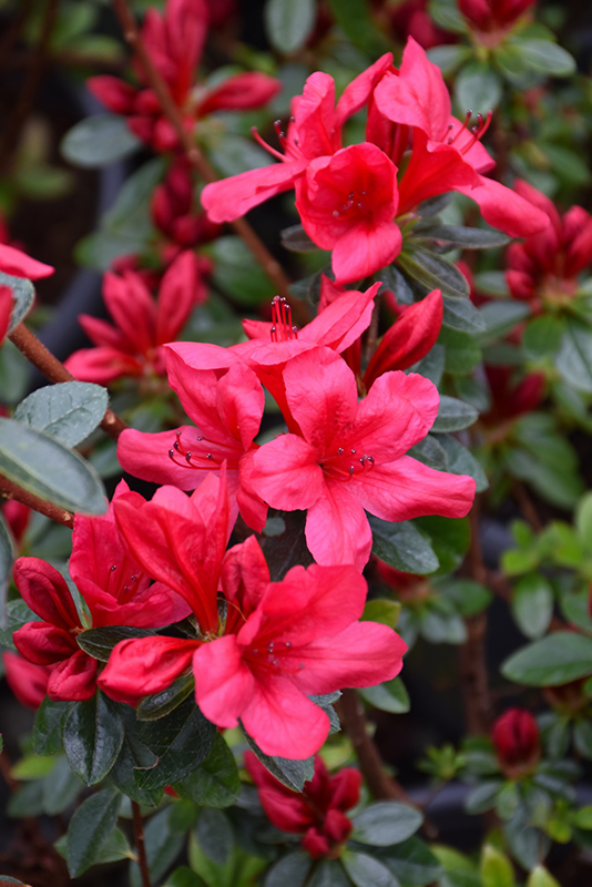 Hardiness Zone: 4b Group/Class: Shammarello Hybrids Description: Clusters of blooms that are bright to deep red cover this azalea in mid to late spring; a compact upright shrub with attractive leaves that progress to yellow in the fall; needs highly acidic and organic soil that is well drained Ornamental Features Red Red Azalea is covered in stunning clusters of lightly-scented red trumpet-shaped flowers at the ends of the branches in mid spring before the leaves. It has olive green deciduous foliage. The small glossy narrow leaves turn an outstanding yellow in the fall. Landscape Attributes Red Red Azalea is an open multi-stemmed deciduous shrub with an upright spreading habit of growth. Its relatively coarse texture can be used to stand it apart from other landscape plants with finer foliage. This is a relatively low maintenance shrub, and should only be pruned after flowering to avoid removing any of the current season's flowers. It has no significant negative characteristics. Red Red Azalea is recommended for the following landscape applications; Planting & Growing Red Red Azalea will grow to be about 5 feet tall at maturity, with a spread of 5 feet. It tends to be a little leggy, with a typical clearance of 1 foot from the ground, and is suitable for planting under power lines. It grows at a slow rate, and under ideal conditions can be expected to live for 40 years or more. This shrub does best in full sun to partial shade. You may want to keep it away from hot, dry locations that receive direct afternoon sun or which get reflected sunlight, such as against the south side of a white wall. It requires an evenly moist well-drained soil for optimal growth, but will die in standing water. It is very fussy about its soil conditions and must have rich, acidic soils to ensure success, and is subject to chlorosis (yellowing) of the foliage in alkaline soils. It is somewhat tolerant of urban pollution, and will benefit from being planted in a relatively sheltered location. Consider applying a thick mulch around the root zone in winter to protect it in exposed locations or colder microclimates. This particular variety is an interspecific hybrid.