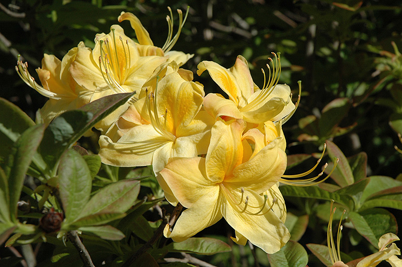 Hardiness Zone: 5b Group/Class: Exbury Hybrids Description: A stunning variety with bright butter yellow blooms with a yellow blotch that cover airy open branches in mid spring; showy when massed in a border or as a garden accent; absolutely must have well-drained, highly acidic and organic soil Ornamental Features Sun Chariot Azalea is covered in stunning clusters of lightly-scented buttery yellow trumpet-shaped flowers with a yellow blotch at the ends of the branches in mid spring before the leaves. It has brick red-spotted green foliage. The narrow leaves turn an outstanding burgundy in the fall. Landscape Attributes Sun Chariot Azalea is an open multi-stemmed deciduous shrub with an upright spreading habit of growth. Its relatively coarse texture can be used to stand it apart from other landscape plants with finer foliage. This is a relatively low maintenance shrub, and should only be pruned after flowering to avoid removing any of the current season's flowers. It has no significant negative characteristics. Sun Chariot Azalea is recommended for the following landscape applications; Planting & Growing Sun Chariot Azalea will grow to be about 5 feet tall at maturity, with a spread of 5 feet. It tends to be a little leggy, with a typical clearance of 1 foot from the ground, and is suitable for planting under power lines. It grows at a slow rate, and under ideal conditions can be expected to live for 40 years or more. This shrub does best in full sun to partial shade. You may want to keep it away from hot, dry locations that receive direct afternoon sun or which get reflected sunlight, such as against the south side of a white wall. It requires an evenly moist well-drained soil for optimal growth, but will die in standing water. It is very fussy about its soil conditions and must have rich, acidic soils to ensure success, and is subject to chlorosis (yellowing) of the foliage in alkaline soils. It is somewhat tolerant of urban pollution, and will benefit from being planted in a relatively sheltered location. Consider applying a thick mulch around the root zone in winter to protect it in exposed locations or colder microclimates. This particular variety is an interspecific hybrid.