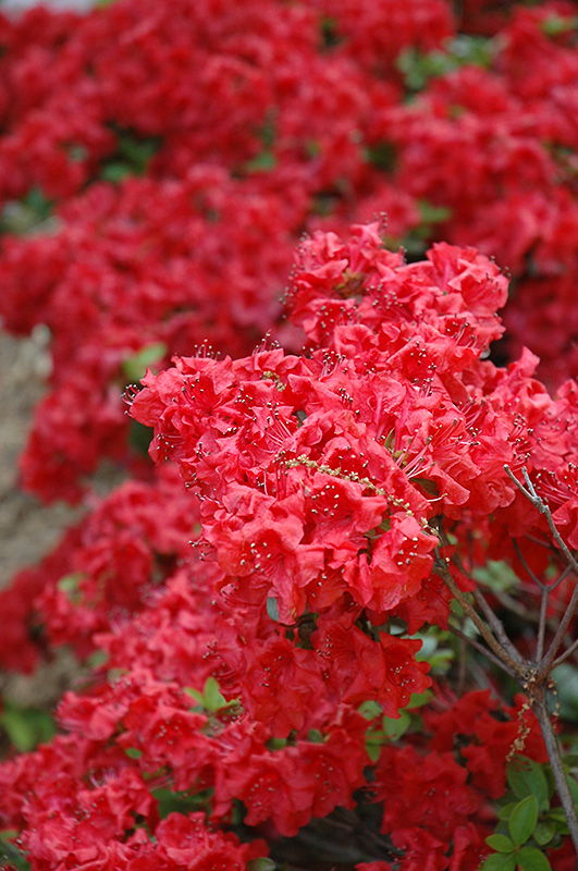 Hardiness Zone: 5a Group/Class: Schroeder Hybrids Description: Clusters of blooms that are deep crimson cover this azalea in mid spring; a compact upright shrub that is great along borders; needs highly acidic and organic soil that is well drained Ornamental Features William Hyatt Azalea is bathed in stunning clusters of lightly-scented crimson trumpet-shaped flowers at the ends of the branches in mid spring before the leaves. It has green deciduous foliage. The small narrow leaves do not develop any appreciable fall color. Landscape Attributes William Hyatt Azalea is an open multi-stemmed deciduous shrub with a more or less rounded form. Its relatively coarse texture can be used to stand it apart from other landscape plants with finer foliage. This is a relatively low maintenance shrub, and should only be pruned after flowering to avoid removing any of the current season's flowers. It has no significant negative characteristics. William Hyatt Azalea is recommended for the following landscape applications; Planting & Growing William Hyatt Azalea will grow to be about 5 feet tall at maturity, with a spread of 5 feet. It tends to be a little leggy, with a typical clearance of 1 foot from the ground, and is suitable for planting under power lines. It grows at a slow rate, and under ideal conditions can be expected to live for 40 years or more. This shrub does best in full sun to partial shade. You may want to keep it away from hot, dry locations that receive direct afternoon sun or which get reflected sunlight, such as against the south side of a white wall. It requires an evenly moist well-drained soil for optimal growth, but will die in standing water. It is very fussy about its soil conditions and must have rich, acidic soils to ensure success, and is subject to chlorosis (yellowing) of the foliage in alkaline soils. It is somewhat tolerant of urban pollution, and will benefit from being planted in a relatively sheltered location. Consider applying a thick mulch around the root zone in winter to protect it in exposed locations or colder microclimates. This particular variety is an interspecific hybrid.