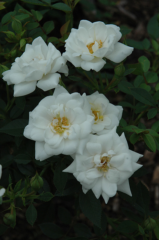 Hardiness Zone: 4b Group/Class: Groundcover Rose Description: This variety is a compact spreading groundcover rose producing cupped to flat semi-double white flowers above deep dark green leaves; its spreading habit makes it perfect as a full sun groundcover foundation planting Ornamental Features Kent Rose features showy fragrant semi-double white flowers with gold eyes at the ends of the branches from late spring to early fall. The flowers are excellent for cutting. It has dark green deciduous foliage. The oval compound leaves do not develop any appreciable fall color. Landscape Attributes Kent Rose is a multi-stemmed deciduous shrub with a ground-hugging habit of growth. Its average texture blends into the landscape, but can be balanced by one or two finer or coarser trees or shrubs for an effective composition. This shrub will require occasional maintenance and upkeep, and is best pruned in late winter once the threat of extreme cold has passed. It is a good choice for attracting bees to your yard. It has no significant negative characteristics. Kent Rose is recommended for the following landscape applications; Planting & Growing Kent Rose will grow to be about 18 inches tall at maturity, with a spread of 3 feet. It tends to fill out right to the ground and therefore doesn't necessarily require facer plants in front. It grows at a fast rate, and under ideal conditions can be expected to live for approximately 30 years. This shrub should only be grown in full sunlight. It does best in average to evenly moist conditions, but will not tolerate standing water. It is not particular as to soil type or pH. It is highly tolerant of urban pollution and will even thrive in inner city environments. This particular variety is an interspecific hybrid. Kent Rose makes a fine choice for the outdoor landscape, but it is also well-suited for use in outdoor pots and containers. Because of its spreading habit of growth, it is ideally suited for use as a 'spiller' in the 'spiller-thriller-filler' container combination; plant it near the edges where it can spill gracefully over the pot. Note that when grown in a container, it may not perform exactly as indicated on the tag - this is to be expected. Also note that when growing plants in outdoor containers and baskets, they may require more frequent waterings than they would in the yard or garden.