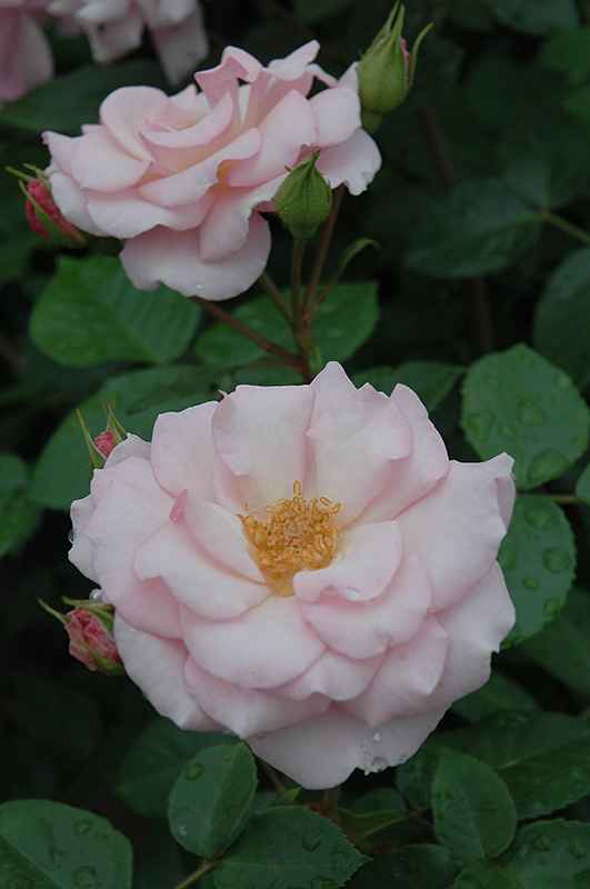 Hardiness Zone: 4b Group/Class: Floribunda Rose Description: Kimberlina is one of the healthiest, toughest, most vigorous floribundas ever introduced; set against glossy green foliage on an upright well branched plant, light pink blooms exhibit a soft-spoken elegance perfect for any mixed landscape Ornamental Features Kimberlina Rose features showy lightly-scented double shell pink flowers with gold eyes at the ends of the branches from mid spring to mid fall. The flowers are excellent for cutting. It has green deciduous foliage. The glossy oval compound leaves do not develop any appreciable fall color. Landscape Attributes Kimberlina Rose is a multi-stemmed deciduous shrub with an upright spreading habit of growth. Its average texture blends into the landscape, but can be balanced by one or two finer or coarser trees or shrubs for an effective composition. This shrub will require occasional maintenance and upkeep, and is best pruned in late winter once the threat of extreme cold has passed. It is a good choice for attracting bees to your yard. It has no significant negative characteristics. Kimberlina Rose is recommended for the following landscape applications; Planting & Growing Kimberlina Rose will grow to be about 4 feet tall at maturity, with a spread of 3 feet. It tends to fill out right to the ground and therefore doesn't necessarily require facer plants in front. It grows at a fast rate, and under ideal conditions can be expected to live for approximately 30 years. This shrub should only be grown in full sunlight. It does best in average to evenly moist conditions, but will not tolerate standing water. It is not particular as to soil type or pH. It is highly tolerant of urban pollution and will even thrive in inner city environments. This particular variety is an interspecific hybrid.