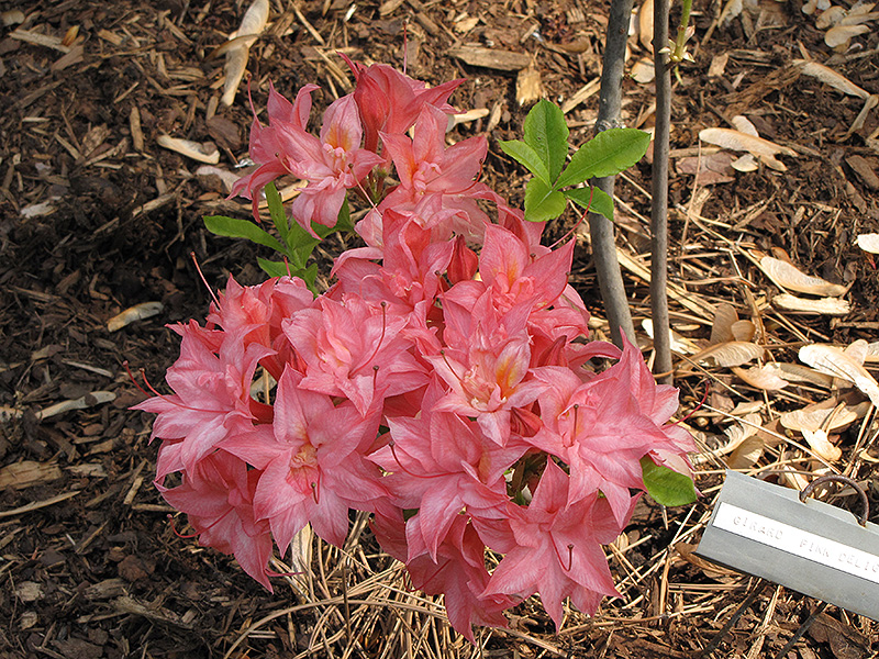 Hardiness Zone: 5a Group/Class: Girard Hybrids Description: This striking azalea shrub is bathed in clusters of beautiful salmon double blooms with unusual pointed petals; an excellent choice to mass in groupings, or as an elegant focal point of the garden; must have rich acidic soil Ornamental Features Pink Delight Azalea is bathed in stunning clusters of lightly-scented double salmon trumpet-shaped flowers with a gold blotch at the ends of the branches in late spring, which emerge from distinctive dark red flower buds before the leaves. It has green deciduous foliage. The narrow leaves do not develop any appreciable fall color. Landscape Attributes Pink Delight Azalea is an open multi-stemmed deciduous shrub with an upright spreading habit of growth. Its relatively coarse texture can be used to stand it apart from other landscape plants with finer foliage. This is a relatively low maintenance shrub, and should only be pruned after flowering to avoid removing any of the current season's flowers. It has no significant negative characteristics. Pink Delight Azalea is recommended for the following landscape applications; Planting & Growing Pink Delight Azalea will grow to be about 4 feet tall at maturity, with a spread of 4 feet. It tends to be a little leggy, with a typical clearance of 1 foot from the ground. It grows at a slow rate, and under ideal conditions can be expected to live for 40 years or more. This shrub does best in full sun to partial shade. You may want to keep it away from hot, dry locations that receive direct afternoon sun or which get reflected sunlight, such as against the south side of a white wall. It requires an evenly moist well-drained soil for optimal growth, but will die in standing water. It is very fussy about its soil conditions and must have rich, acidic soils to ensure success, and is subject to chlorosis (yellowing) of the foliage in alkaline soils. It is somewhat tolerant of urban pollution, and will benefit from being planted in a relatively sheltered location. Consider applying a thick mulch around the root zone in winter to protect it in exposed locations or colder microclimates. This particular variety is an interspecific hybrid.