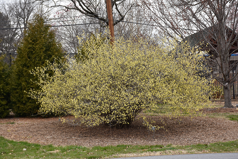 Hardiness Zone: 6a Description: This radiant garden shrub is a harbinger of spring; dainty fragrant buttery-yellow flowers hang from bare branches in late winter, good habit of growth, and excellent fall color Ornamental Features Spike Winterhazel features delicate clusters of fragrant buttery yellow flowers hanging below the branches in late winter. It has green deciduous foliage. The heart-shaped leaves turn an outstanding yellow in the fall. Landscape Attributes Spike Winterhazel is a dense multi-stemmed deciduous shrub with a more or less rounded form. Its average texture blends into the landscape, but can be balanced by one or two finer or coarser trees or shrubs for an effective composition. This is a relatively low maintenance shrub, and should only be pruned after flowering to avoid removing any of the current season's flowers. It has no significant negative characteristics. Spike Winterhazel is recommended for the following landscape applications; Planting & Growing Spike Winterhazel will grow to be about 6 feet tall at maturity, with a spread of 8 feet. It has a low canopy with a typical clearance of 1 foot from the ground, and is suitable for planting under power lines. It grows at a slow rate, and under ideal conditions can be expected to live for 40 years or more. This shrub performs well in both full sun and full shade. It prefers to grow in average to moist conditions, and shouldn't be allowed to dry out. It is particular about its soil conditions, with a strong preference for rich, acidic soils. It is somewhat tolerant of urban pollution, and will benefit from being planted in a relatively sheltered location. Consider applying a thick mulch around the root zone in winter to protect it in exposed locations or colder microclimates. This species is not originally from North America.