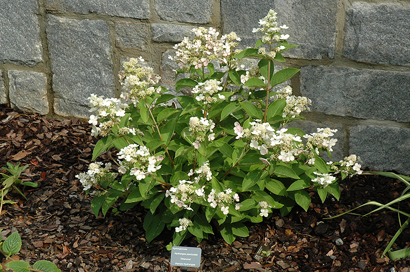Hardiness Zone: 3b Description: A showy early mid-summer blooming shrub with cone-shaped panicles of mixed sterile and fertile white flowers which turn pink in late summer to fall; somewhat coarse in appearance, regular pruning recommended; needs slightly acidic well-drained soil Ornamental Features Dharuma Hydrangea features bold conical white flowers at the ends of the branches from mid summer to early fall. The flowers are excellent for cutting. It has green deciduous foliage. The pointy leaves do not develop any appreciable fall color. Landscape Attributes Dharuma Hydrangea is a multi-stemmed deciduous shrub with an upright spreading habit of growth. Its relatively coarse texture can be used to stand it apart from other landscape plants with finer foliage. This shrub will require occasional maintenance and upkeep, and is best pruned in late winter once the threat of extreme cold has passed. It has no significant negative characteristics. Dharuma Hydrangea is recommended for the following landscape applications; Planting & Growing Dharuma Hydrangea will grow to be about 5 feet tall at maturity, with a spread of 4 feet. It tends to be a little leggy, with a typical clearance of 2 feet from the ground, and is suitable for planting under power lines. It grows at a medium rate, and under ideal conditions can be expected to live for 40 years or more. This shrub does best in full sun to partial shade. It prefers to grow in average to moist conditions, and shouldn't be allowed to dry out. It is not particular as to soil type, but has a definite preference for acidic soils. It is highly tolerant of urban pollution and will even thrive in inner city environments. Consider applying a thick mulch around the root zone in winter to protect it in exposed locations or colder microclimates. This is a selected variety of a species not originally from North America.